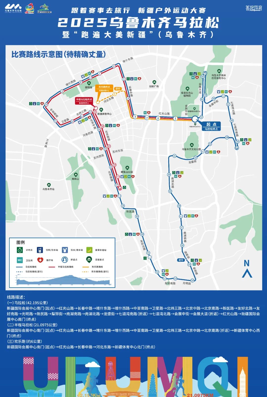 其中马拉松项目采用“闭环赛道”设计,赛事起终点均为新疆国际会展中心南门欢乐跑(约6公里)终点为新疆体育中心北门;半程马拉松(21.0975公里)终点则为新疆体育中心西门。