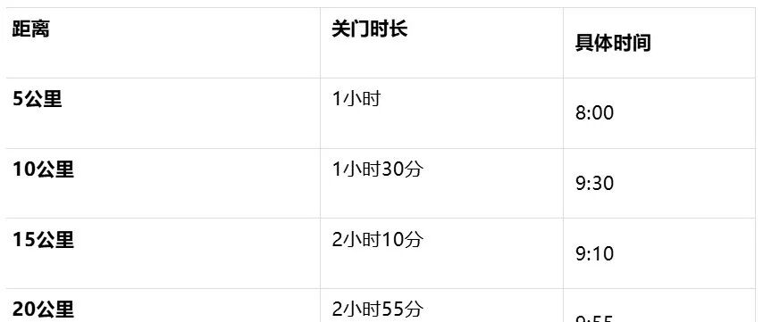 (七)关门时间:为了保证参赛选手比赛安全,限时对社会交通进行滚动封闭。比赛路线各段专设了赛事关门时间,到了关门时间,相应公里点的计时地毯停止工作,相应路段将恢复社会交通。在规定关门时间内,未跑完对应距离的参赛选手须立即停止比赛,退出赛道,以免发生危险。退出比赛的选手可搭乘沿途的收容车抵达终点或自行选乘公共交通离开。大运河组关门时间和距离(以枪声的出发时间为准)具体见下表: