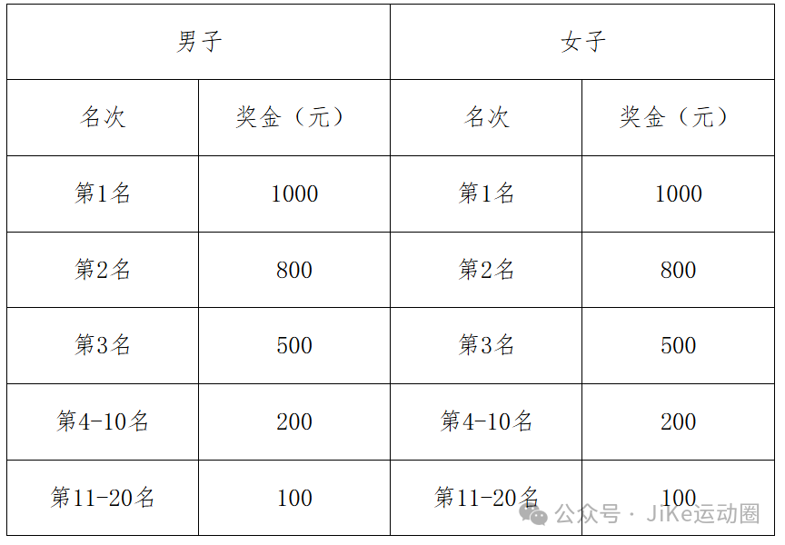 (一)大运河组名次奖根据枪声计时成绩录取男、女前十名运动员,他们分别获得奖金(单位:人民币元);前三名另外颁发奖杯一座。