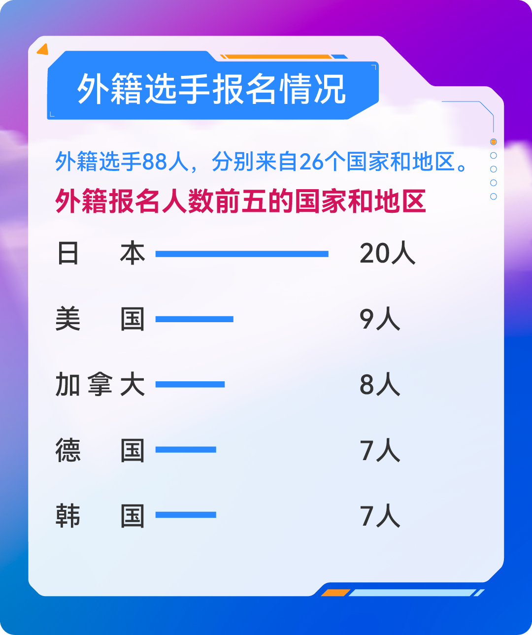 本次报名吸引了来自26个国家和地区88名外籍选手参与,其中外籍报名人数排名前五的国家和地区依次为日本、美国、加拿大、德国、韩国,不同地域、不同语言的跑者,因奔跑相聚亦庄,因热爱奔赴同行。