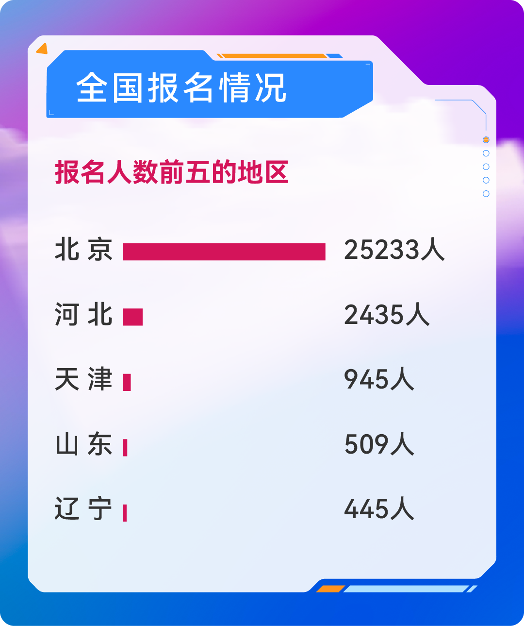 全国报名人数排名前五的地区依次为北京、河北、天津、山东、辽宁。