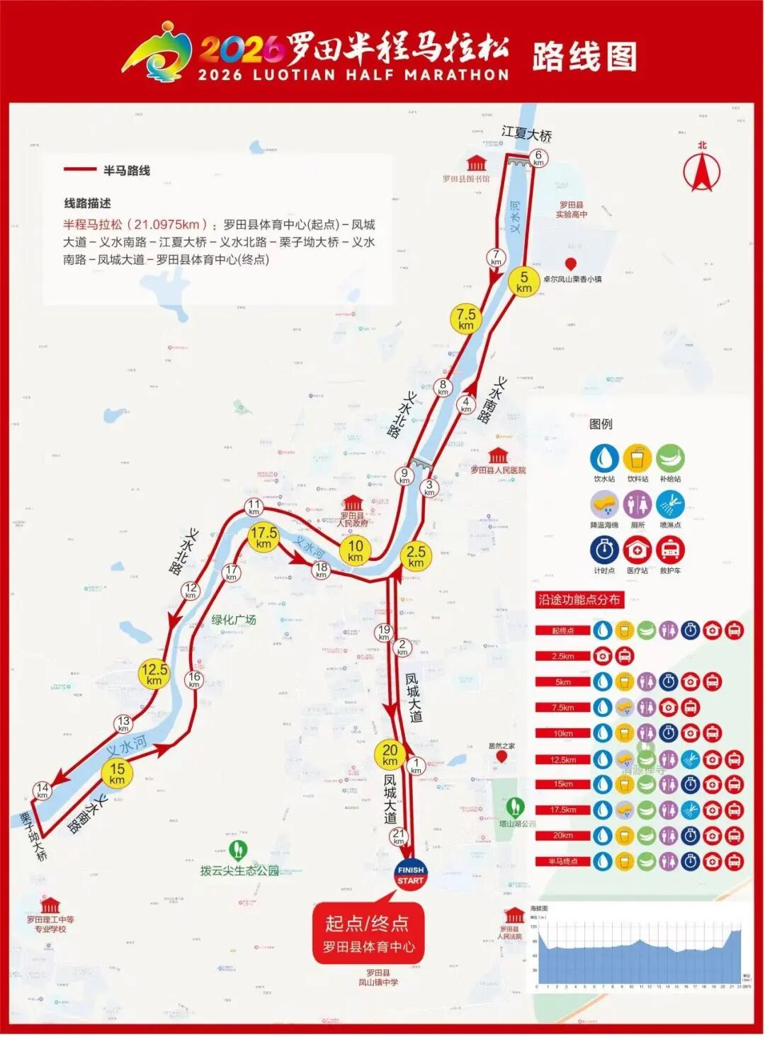- 路线:罗田县体育中心 → 凤城大道 → 义水南路 → 江夏大桥 → 义水北路 → 义水大桥 → 拨云路 → 大别山大道(折返) → 丝绸大道 → 栗乡大道(折返) → 丰衣路 → 凤城大道 → 罗田县体育中心(终点)
